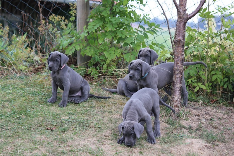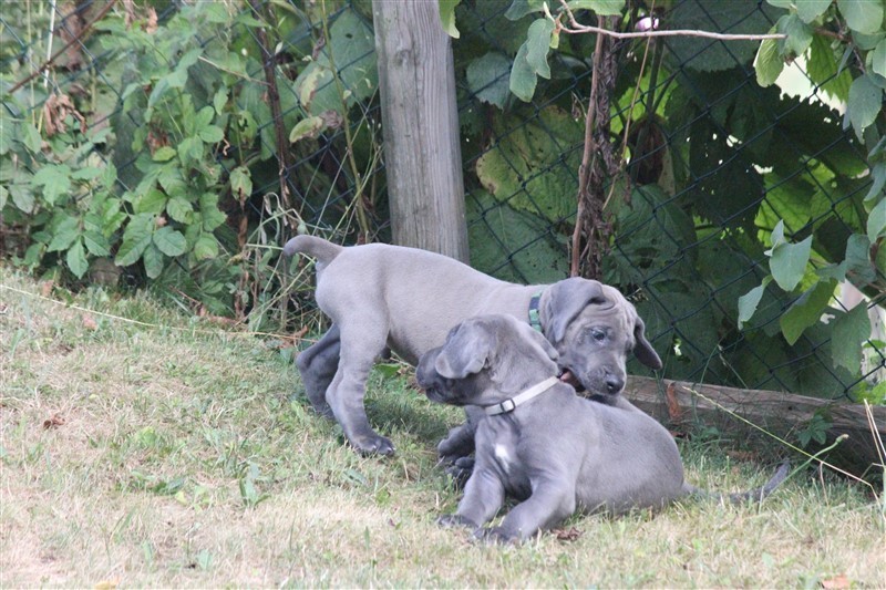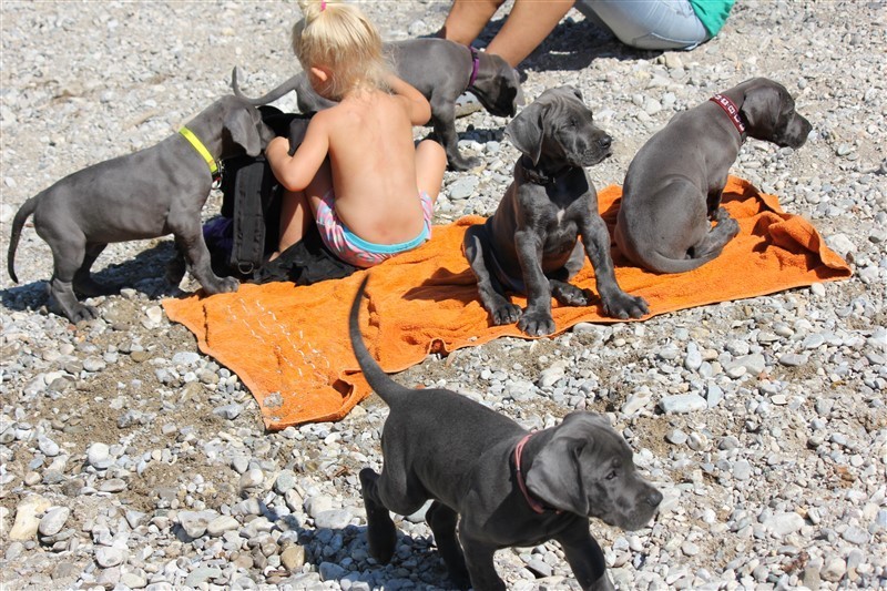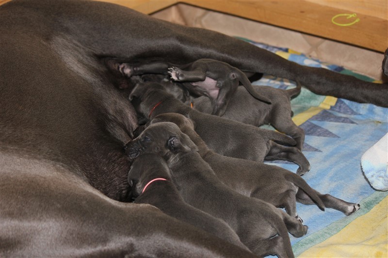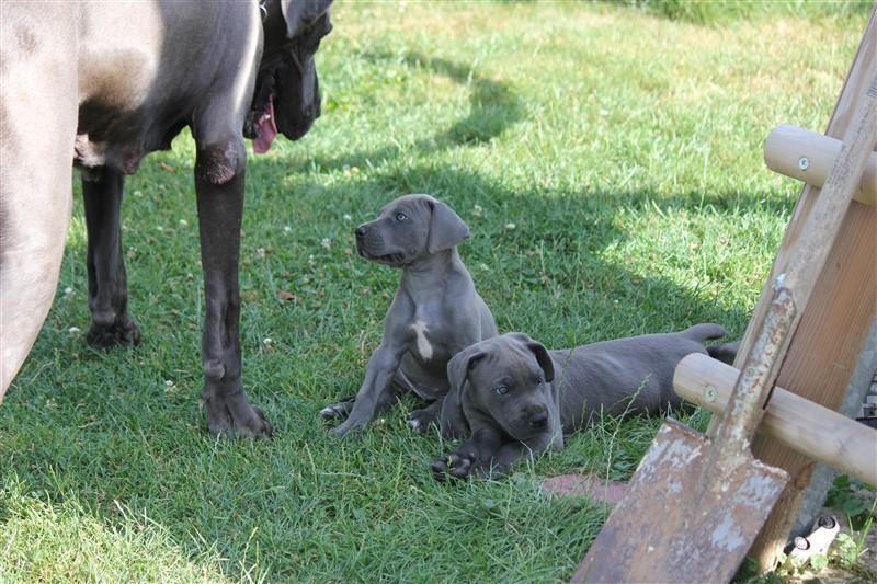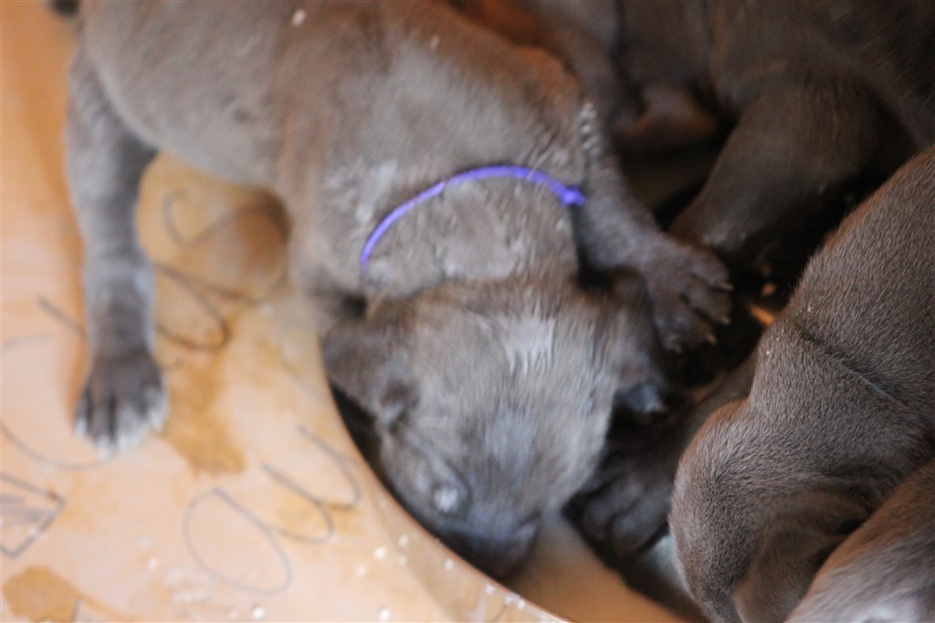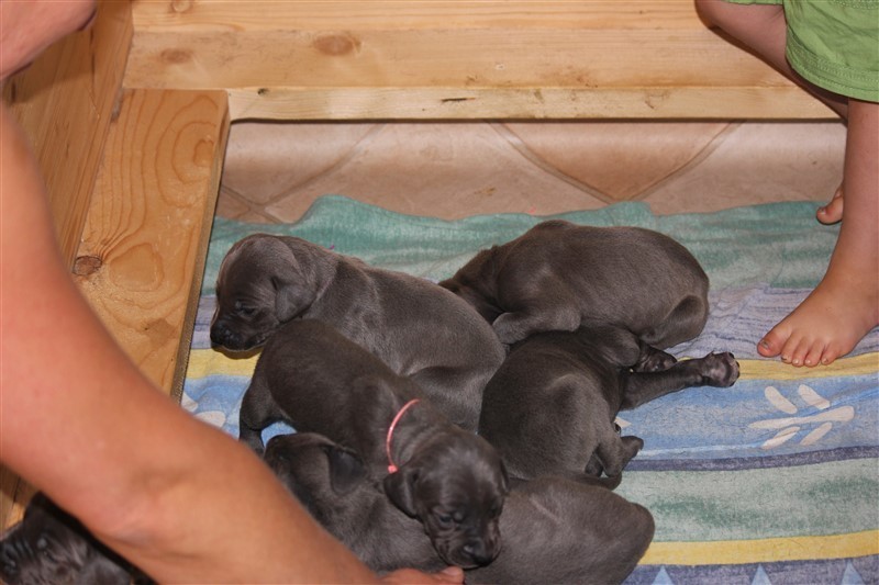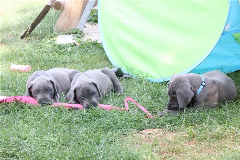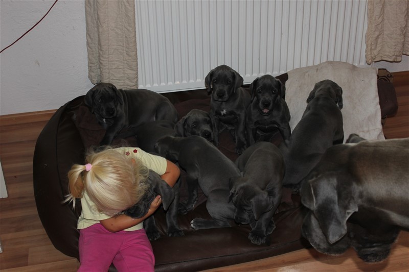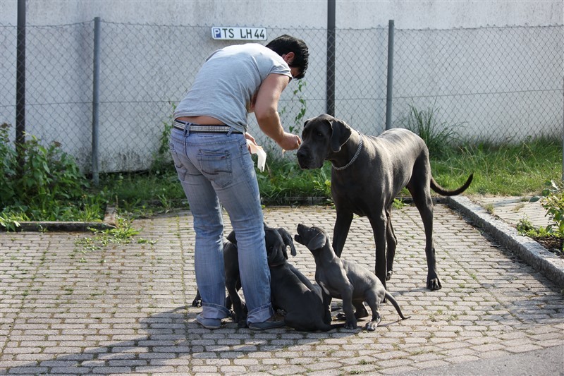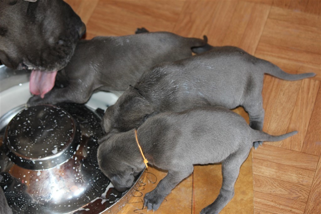Unsere Babys sind jetzt in die Welpenhütte gezogen. Hier haben sie mehr Platz und können mittlerweile auch in den Außenbereich. Noch wird hier nur kurz, so etwa 10 Minuten gespielt, dann brauchen sie wieder ihren Schönheitsschlaf. Anfang der 3. Woche haben wir mit Ziegenmilchmahlzeiten angefangen. Die Kleinen lieben das schlabbern aus dem Welpenring und danach liebt es Akuma alle/s sauber zu machen, einschließlich der Schüssel. Mit 3,5 Wochen haben wir mit Fleischmahlzeiten angefangen. Alle vertragen es gut und freuen sich auf das Fleisch.
