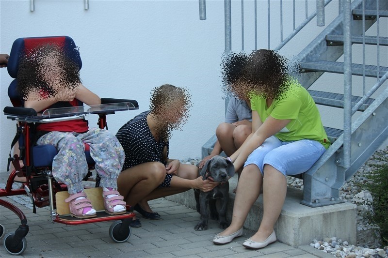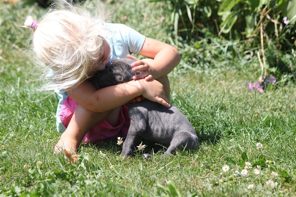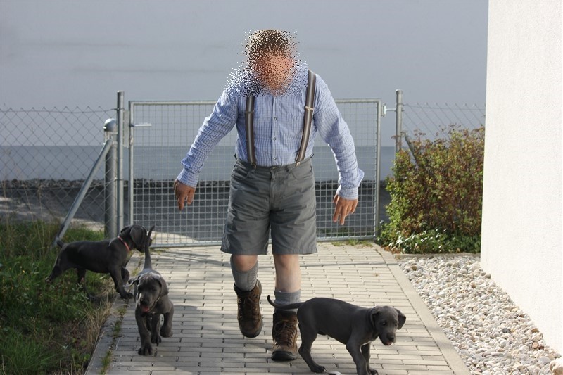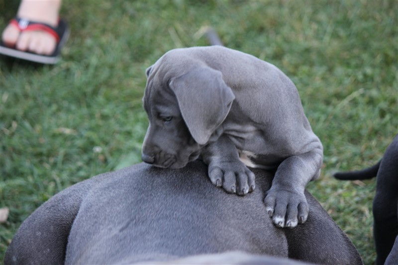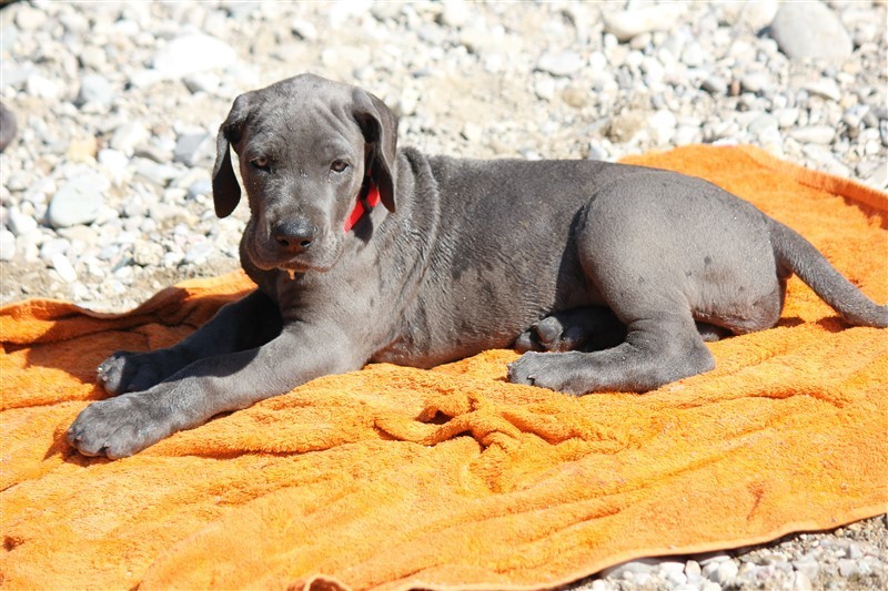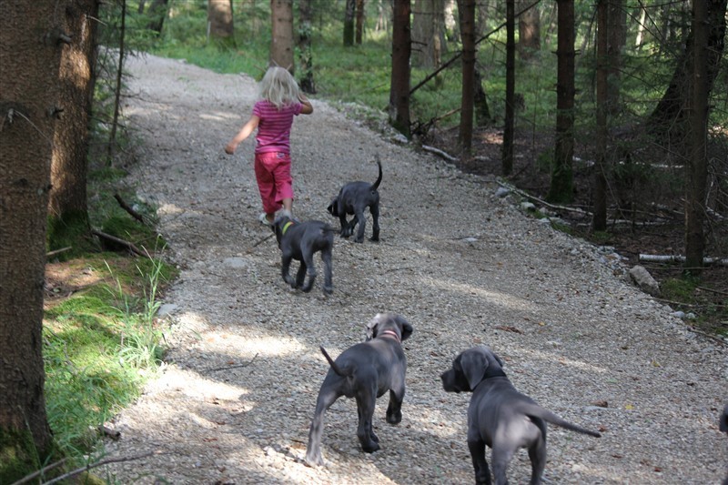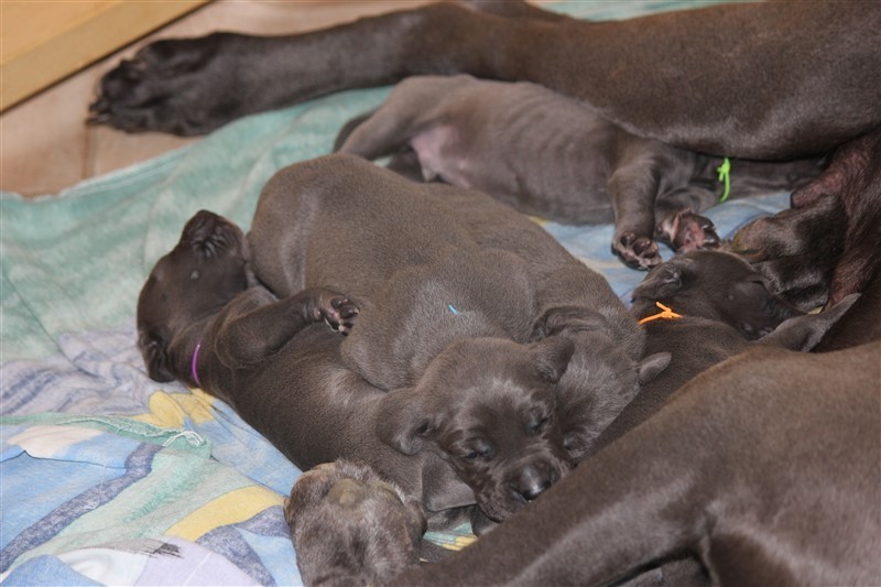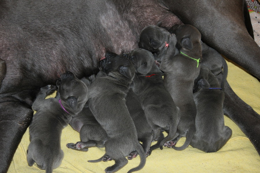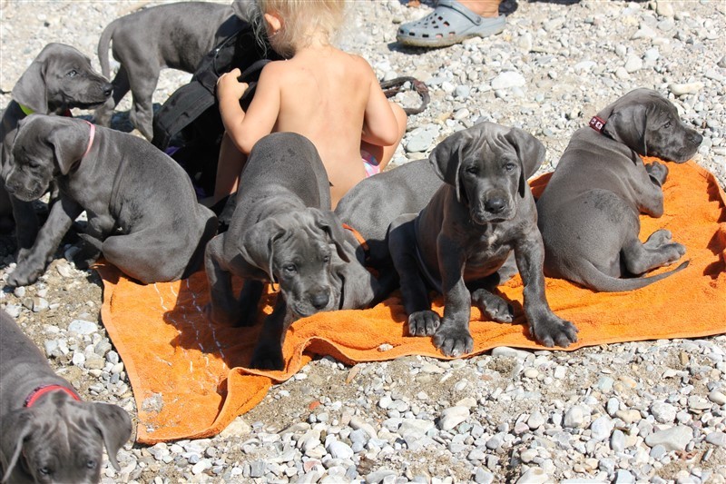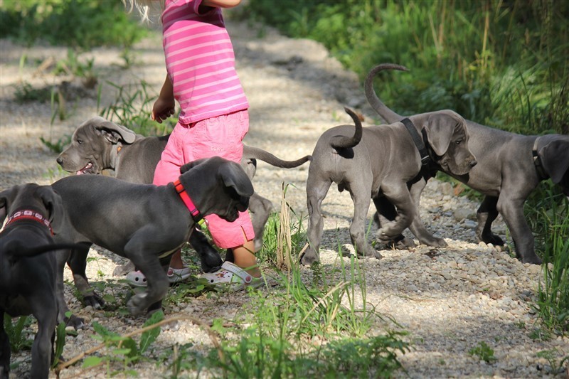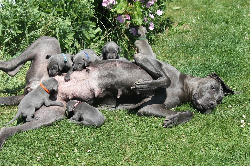 Unsere Babys sind jetzt in die Welpenhütte gezogen. Hier haben sie mehr Platz und können mittlerweile auch in den Außenbereich. Noch wird hier nur kurz, so etwa 10 Minuten gespielt, dann brauchen sie wieder ihren Schönheitsschlaf. Anfang der 3. Woche haben wir mit Ziegenmilchmahlzeiten angefangen. Die Kleinen lieben das schlabbern aus dem Welpenring und danach liebt es Akuma alle/s sauber zu machen, einschließlich der Schüssel. Mit 3,5 Wochen haben wir mit Fleischmahlzeiten angefangen. Alle vertragen es gut und freuen sich auf das Fleisch.